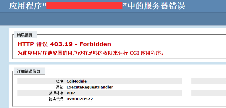 这 是没有对应脚本执行权限的问题,如果是虚拟主机,查看核实是否是asp.net程序没有开启脚本权限,虚拟主机控制面板点击asp.net版本,选择版本 进行开启支持。检查是否设置了目录保护,目录保护以后该目录就没有执行脚本权限。另外也可能是兼容性问题,主机控制面板程序兼容模式切换到32位进行尝 试。服务器则请检查创建站点时是否设置了对应的脚本权限。 13、windows2008+iis7服务器出现 HTTP 错误 403.19 - Forbidden 为此应用程序池配置的用户没有足够的权限来运行 CGI 应用程序。