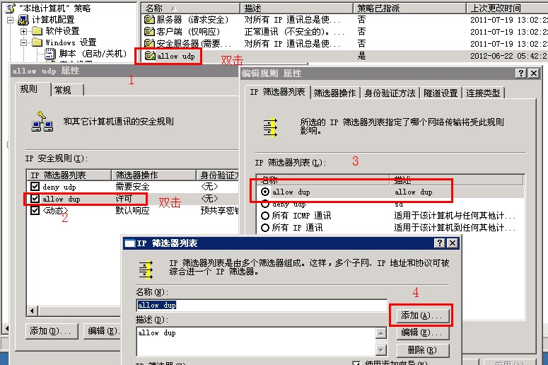 第一步:首先远程登录到服务器,远程登录请参考 http://www.com.top/help/productfaq/24.html 登录以后在运行里面输入gpedit.msc回车,依次展开 计算机配置--windows设置--安全设置 打开IP安全策略,然后找到allow udp,如下图所示: