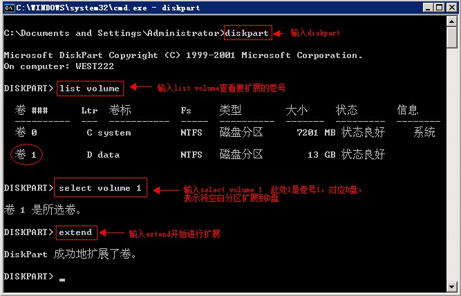 最后提示:DiskPart 成功地扩展了卷。 就说明扩展已经完成,直接关闭命令窗口查看下D盘空间是否已经变大了。 |