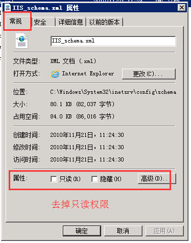 再次右键IIS_schema.xml文件--属性 把只读权限去掉