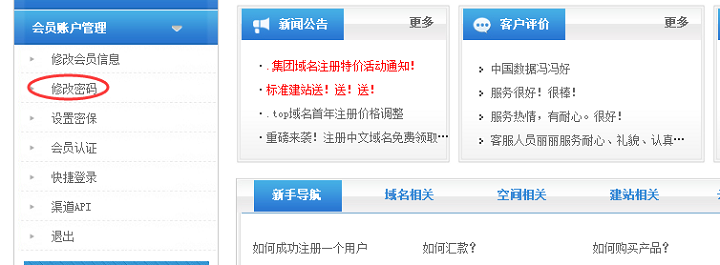 (1)登陆我司网站 www.com.top 输入用户名与密码后,点左侧的会员账户管理——修改密码(如图1)