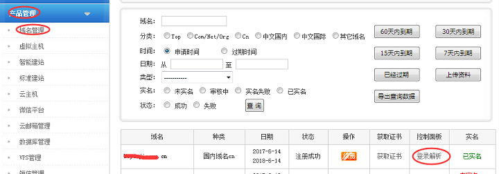(1)登陆我司网站www.com.top输入用户名与密码后,点产品管理——域名管理——登录解析(如图1)