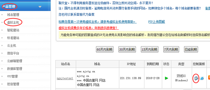 (1)登陆我司网站www.com.top,输入用户名与密码后,点产品管理——虚拟主机——登录控制面板(如图1)