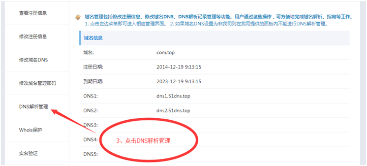 2.进入域名控制面板中,可以看到左边的“DNS解析管理”
