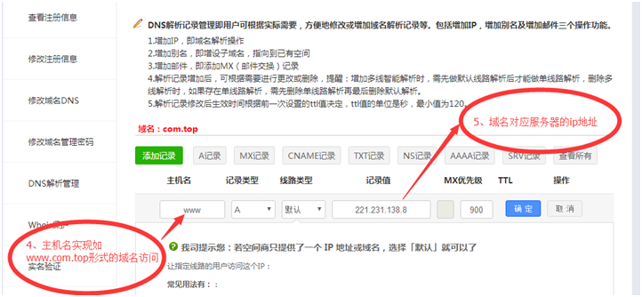 3.点“DNS解析管理”,然后点“添加记录”,可以做“A记录”、“ cname记录(别名记录)”、“ MX记录(邮箱记录)”