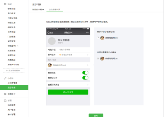 公众号运营者可在公众号后台-小程序-展示场景-公众号资料页内,选择展示已关联的小程序。